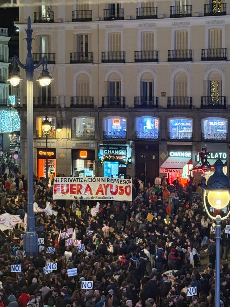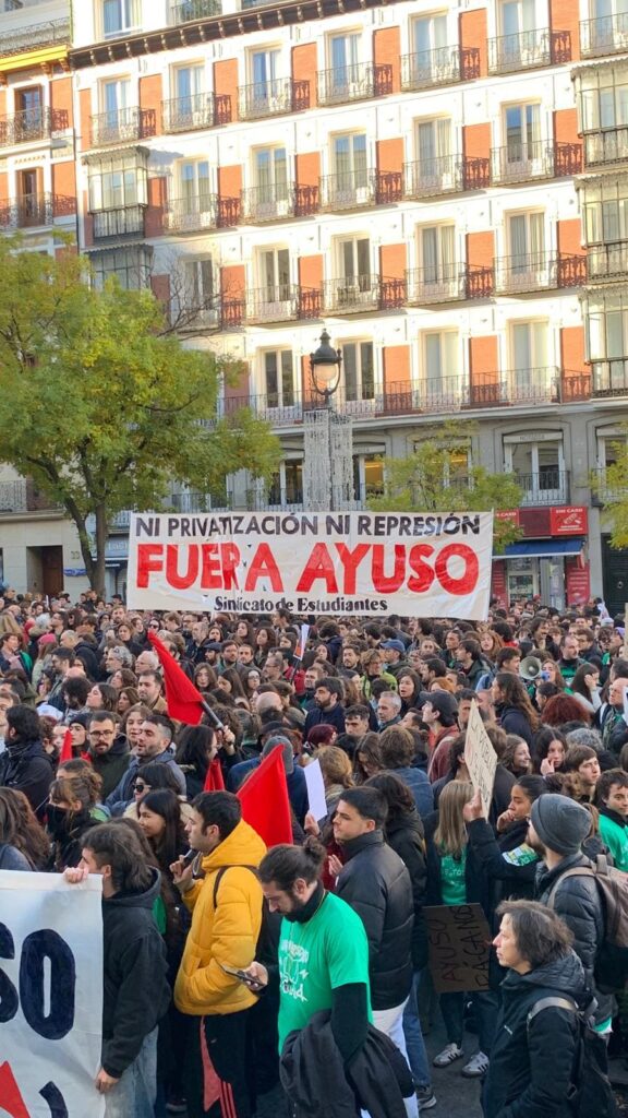 Lo que estamos dejando muy claro es que no vamos a consentir que gente como Ayuso se cargue nuestra universidad pública y que no vamos a quedarnos parados mientras todas nuestras condiciones de vida cada vez retroceden más. Es que venimos de dos huelgas estudiantiles contra el genocidio en Palestina que han vaciado las aulas y han llenado las calles de todo el Estado español. La huelga del pasado 28 de octubre contra el acoso escolar por el suicidio de Sandra Peña que volvió a sacar a cientos de miles de estudiantes a las calles con un claro mensaje antifascista. Luego, esta misma semana, hemos tenido la huelga universitaria en la que otra vez decenas de miles hemos vuelto también a salir a las calles y hemos dejado muy claro. En la manifestación, los cánticos que sonaban eran cánticos contra Ayuso, eran cánticos contra Almeida, eran cánticos contra los sionistas, eran cánticos contra todos estos elementos fascistoides que quieren arrebatarnos todo lo que han sido conquistas del Movimiento Obrero y del Movimiento Estudiantil. Y es que lo estamos dejando muy claro. Y a pesar de todos los artículos que puedan publicar los medios tradicionales como El País o lo que sea intentando vendernos que los jóvenes somos de derechas, la realidad es otra y lo vamos a seguir defendiendo y lo vamos a seguir demostrando. Que es que los jóvenes somos de izquierdas y somos antifascistas y nos estamos movilizando cada vez más.